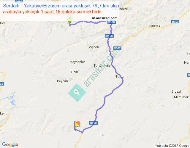 Serdarlı - Yakutiye Erzurum arası yaklaşık olarak 90 km/h ile yukarıda belirtilen sürede olup, iki yerin kuş uçuşu uzaklığı (mesafesi) 41'dir. Yolculuk otobüsle 1 saat 41 dakika sürmektedir.