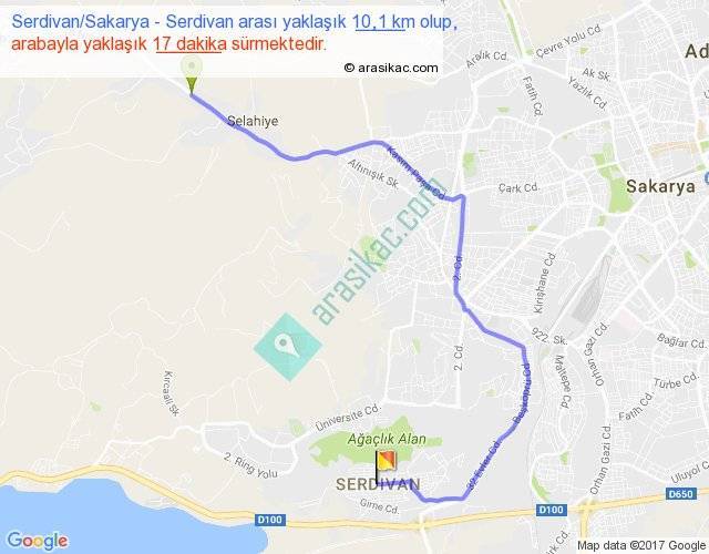 Serdivan Sakarya - Serdivan arası yaklaşık olarak 90 km/h ile yukarıda belirtilen sürede olup, iki yerin kuş uçuşu uzaklığı (mesafesi) 6'dir. Yolculuk otobüsle 22 dakika sürmektedir.