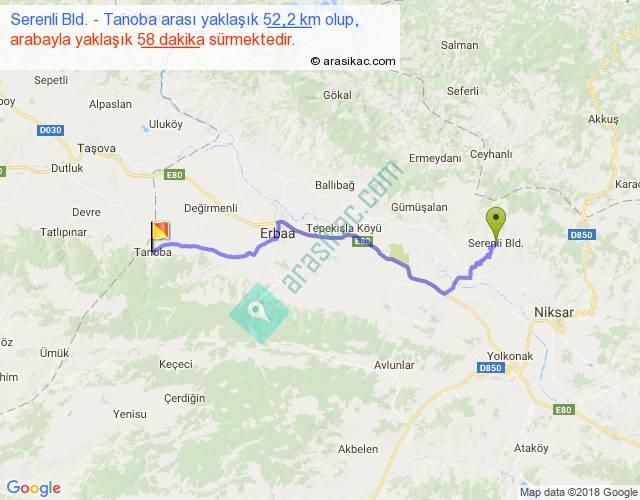 Serenli Bld. - Tanoba arası yaklaşık olarak 90 km/h ile yukarıda belirtilen sürede olup, iki yerin kuş uçuşu uzaklığı (mesafesi) 39'dir. Yolculuk otobüsle 1 saat 15 dakika sürmektedir.