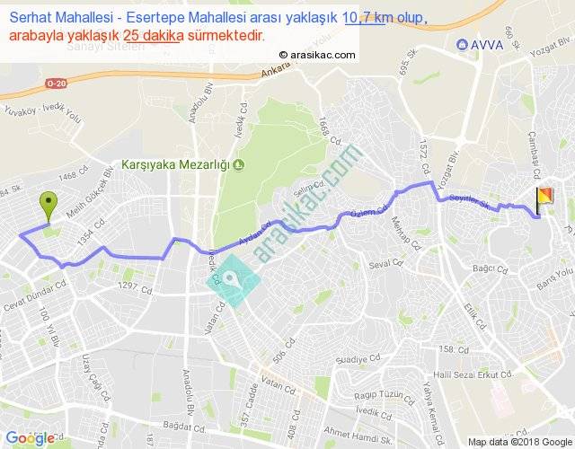 Serhat Mahallesi - Esertepe Mahallesi arası yaklaşık olarak 90 km/h ile yukarıda belirtilen sürede olup, iki yerin kuş uçuşu uzaklığı (mesafesi) 8'dir. Yolculuk otobüsle 32 dakika sürmektedir.