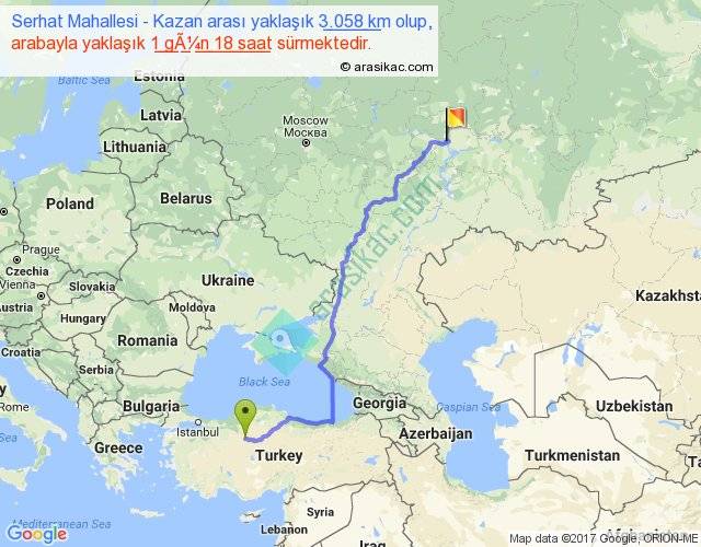 Serhat Mahallesi - Kazan arası yaklaşık olarak 90 km/h ile yukarıda belirtilen sürede olup, iki yerin kuş uçuşu uzaklığı (mesafesi) 2116'dir. Eğer belirtilen yerler arasında uçak seferi var ise bu süre uçakla 3 saat 15 dakika'ya kadar düşebilir. Yolculuk otobüsle 2 gün 6 saat sürmektedir.