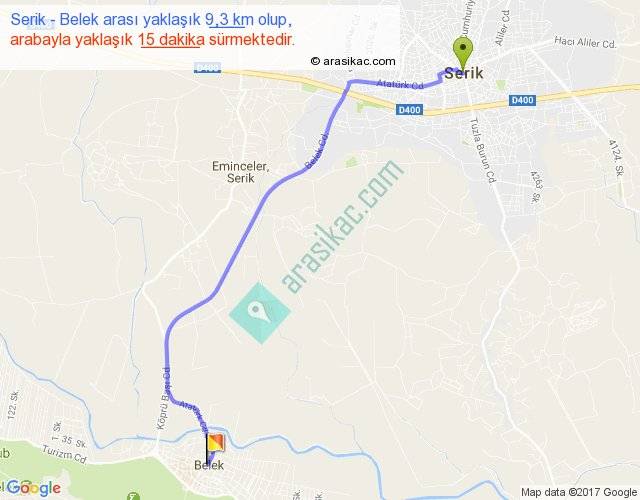 Serik - Belek arası yaklaşık olarak 90 km/h ile yukarıda belirtilen sürede olup, iki yerin kuş uçuşu uzaklığı (mesafesi) 8'dir. Yolculuk otobüsle 20 dakika sürmektedir.