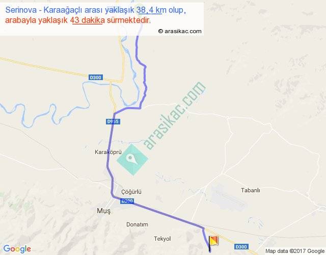 Serinova - Karaağaçlı arası yaklaşık olarak 90 km/h ile yukarıda belirtilen sürede olup, iki yerin kuş uçuşu uzaklığı (mesafesi) 28'dir. Yolculuk otobüsle 55 dakika sürmektedir.