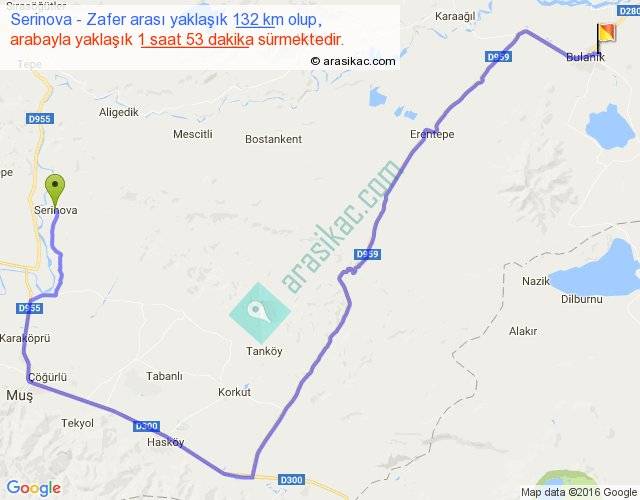 Serinova - Zafer arası yaklaşık olarak 90 km/h ile yukarıda belirtilen sürede olup, iki yerin kuş uçuşu uzaklığı (mesafesi) 67'dir. Yolculuk otobüsle 2 saat 26 dakika sürmektedir.