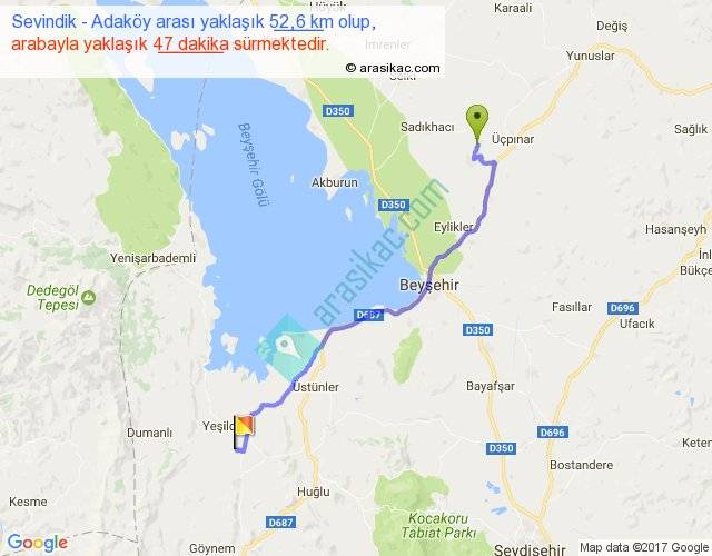 Sevindik - Adaköy arası yaklaşık olarak 90 km/h ile yukarıda belirtilen sürede olup, iki yerin kuş uçuşu uzaklığı (mesafesi) 42'dir. Yolculuk otobüsle 1 saat 1 dakika sürmektedir.