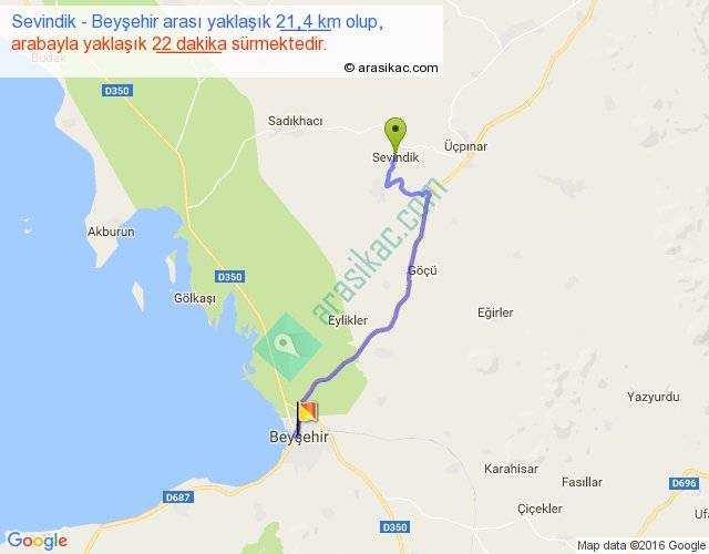 Sevindik - Beyşehir arası yaklaşık olarak 90 km/h ile yukarıda belirtilen sürede olup, iki yerin kuş uçuşu uzaklığı (mesafesi) 16'dir. Yolculuk otobüsle 28 dakika sürmektedir.