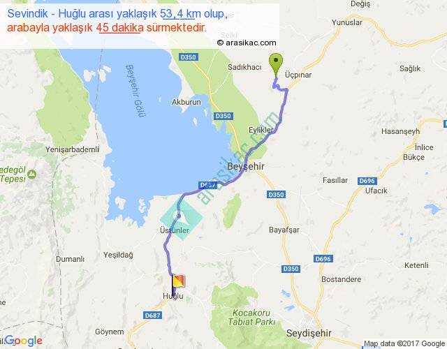 Sevindik - Huğlu arası yaklaşık olarak 90 km/h ile yukarıda belirtilen sürede olup, iki yerin kuş uçuşu uzaklığı (mesafesi) 42'dir. Yolculuk otobüsle 58 dakika sürmektedir.