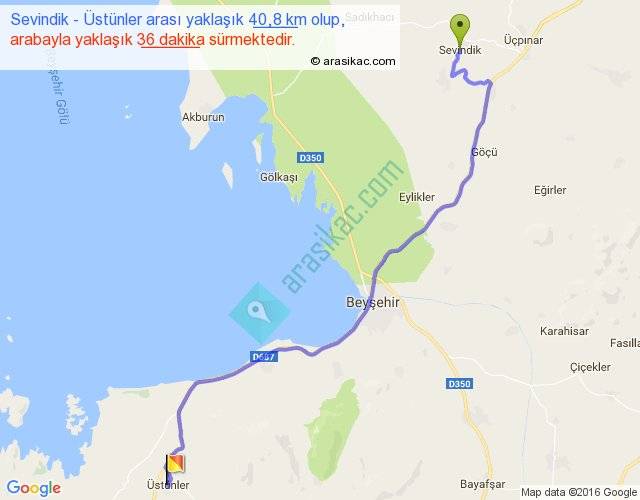 Sevindik - Üstünler arası yaklaşık olarak 90 km/h ile yukarıda belirtilen sürede olup, iki yerin kuş uçuşu uzaklığı (mesafesi) 31'dir. Yolculuk otobüsle 46 dakika sürmektedir.