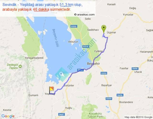 Sevindik - Yeşildağ arası yaklaşık olarak 90 km/h ile yukarıda belirtilen sürede olup, iki yerin kuş uçuşu uzaklığı (mesafesi) 41'dir. Yolculuk otobüsle 59 dakika sürmektedir.