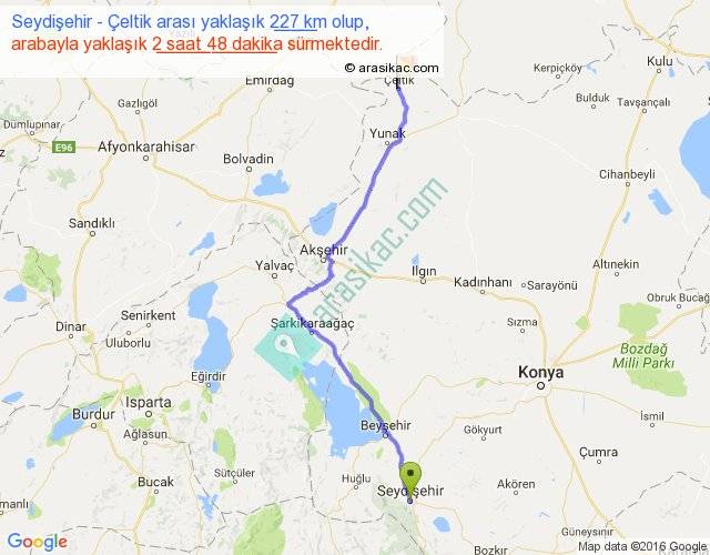 Seydişehir - Çeltik arası yaklaşık olarak 90 km/h ile yukarıda belirtilen sürede olup, iki yerin kuş uçuşu uzaklığı (mesafesi) 177'dir. Yolculuk otobüsle 3 saat 38 dakika sürmektedir.