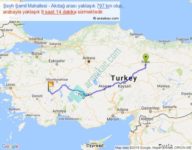 Şeyh Şamil Mahallesi - Akdağ arası yaklaşık olarak 90 km/h ile yukarıda belirtilen sürede olup, iki yerin kuş uçuşu uzaklığı (mesafesi) 633'dir. Eğer belirtilen yerler arasında uçak seferi var ise bu süre uçakla 58 dakika'ya kadar düşebilir. Yolculuk otobüsle 12 saat 0 dakika sürmektedir.
