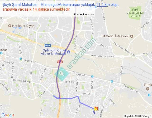 Şeyh Şamil Mahallesi - Etimesgut Ankara arası yaklaşık olarak 90 km/h ile yukarıda belirtilen sürede olup, iki yerin kuş uçuşu uzaklığı (mesafesi) 6'dir. Yolculuk otobüsle 18 dakika sürmektedir.
