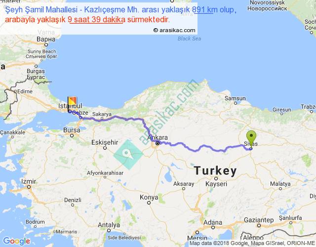 Şeyh Şamil Mahallesi - Kazlıçeşme Mh. arası yaklaşık olarak 90 km/h ile yukarıda belirtilen sürede olup, iki yerin kuş uçuşu uzaklığı (mesafesi) 698'dir. Eğer belirtilen yerler arasında uçak seferi var ise bu süre uçakla 1 saat 04 dakika'ya kadar düşebilir. Yolculuk otobüsle 12 saat 32 dakika sürmektedir.