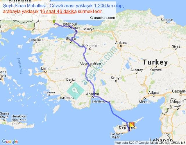 Şeyh Sinan Mahallesi - Cevizli arası yaklaşık olarak 90 km/h ile yukarıda belirtilen sürede olup, iki yerin kuş uçuşu uzaklığı (mesafesi) 859'dir. Eğer belirtilen yerler arasında uçak seferi var ise bu süre uçakla 1 saat 19 dakika'ya kadar düşebilir. Yolculuk otobüsle 21 saat 47 dakika sürmektedir.