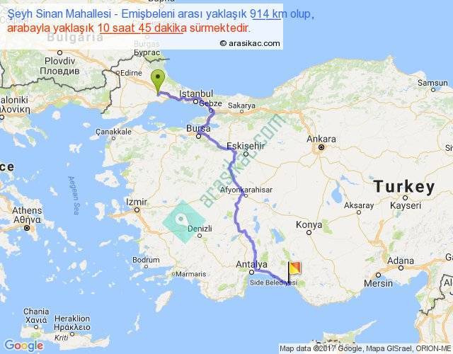 Şeyh Sinan Mahallesi - Emişbeleni arası yaklaşık olarak 90 km/h ile yukarıda belirtilen sürede olup, iki yerin kuş uçuşu uzaklığı (mesafesi) 613'dir. Eğer belirtilen yerler arasında uçak seferi var ise bu süre uçakla 56 dakika'ya kadar düşebilir. Yolculuk otobüsle 13 saat 58 dakika sürmektedir.