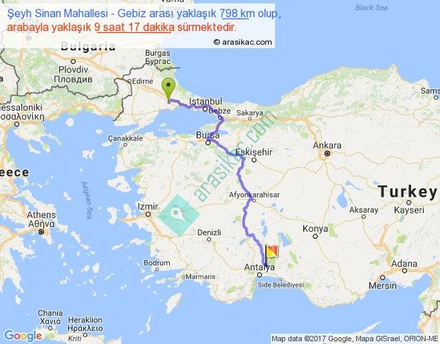 Şeyh Sinan Mahallesi - Gebiz arası yaklaşık olarak 90 km/h ile yukarıda belirtilen sürede olup, iki yerin kuş uçuşu uzaklığı (mesafesi) 522'dir. Eğer belirtilen yerler arasında uçak seferi var ise bu süre uçakla 48 dakika'ya kadar düşebilir. Yolculuk otobüsle 12 saat 4 dakika sürmektedir.