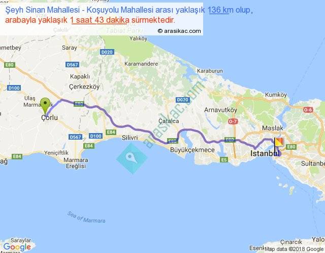 Şeyh Sinan Mahallesi - Koşuyolu Mahallesi arası yaklaşık olarak 90 km/h ile yukarıda belirtilen sürede olup, iki yerin kuş uçuşu uzaklığı (mesafesi) 105'dir. Yolculuk otobüsle 2 saat 13 dakika sürmektedir.