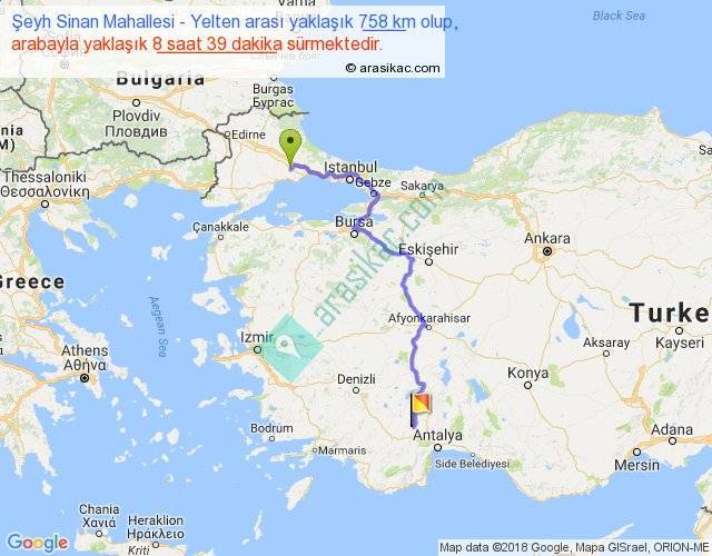 Şeyh Sinan Mahallesi - Yelten arası yaklaşık olarak 90 km/h ile yukarıda belirtilen sürede olup, iki yerin kuş uçuşu uzaklığı (mesafesi) 483'dir. Eğer belirtilen yerler arasında uçak seferi var ise bu süre uçakla 44 dakika'ya kadar düşebilir. Yolculuk otobüsle 11 saat 14 dakika sürmektedir.