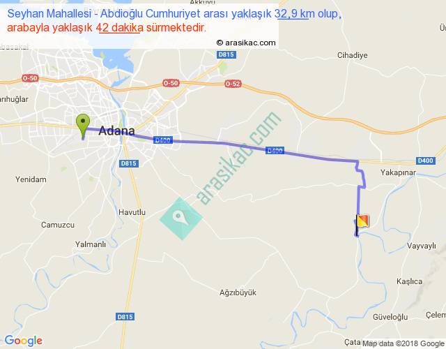 Seyhan Mahallesi - Abdioğlu Cumhuriyet arası yaklaşık olarak 90 km/h ile yukarıda belirtilen sürede olup, iki yerin kuş uçuşu uzaklığı (mesafesi) 25'dir. Yolculuk otobüsle 54 dakika sürmektedir.