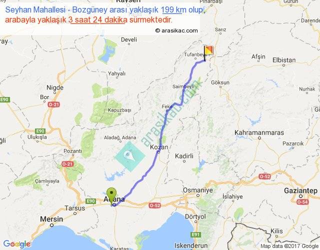 Seyhan Mahallesi - Bozgüney arası yaklaşık olarak 90 km/h ile yukarıda belirtilen sürede olup, iki yerin kuş uçuşu uzaklığı (mesafesi) 166'dir. Yolculuk otobüsle 4 saat 25 dakika sürmektedir.