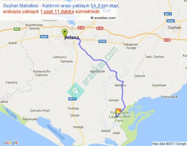 Seyhan Mahallesi - Kaldırım arası yaklaşık olarak 90 km/h ile yukarıda belirtilen sürede olup, iki yerin kuş uçuşu uzaklığı (mesafesi) 39'dir. Yolculuk otobüsle 1 saat 32 dakika sürmektedir.