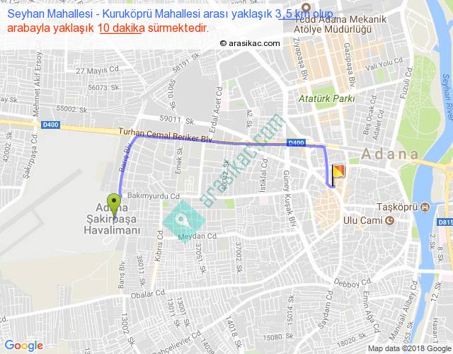 Seyhan Mahallesi - Kuruköprü Mahallesi arası yaklaşık olarak 90 km/h ile yukarıda belirtilen sürede olup, iki yerin kuş uçuşu uzaklığı (mesafesi) 2'dir. Yolculuk otobüsle 13 dakika sürmektedir.