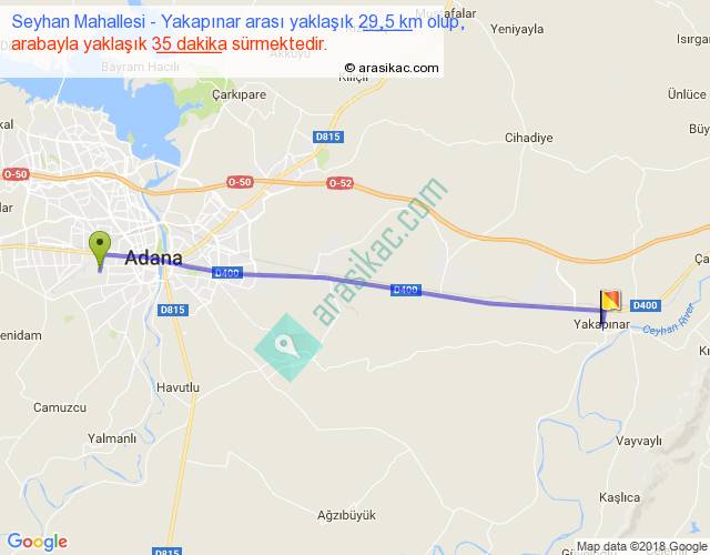 Seyhan Mahallesi - Yakapınar arası yaklaşık olarak 90 km/h ile yukarıda belirtilen sürede olup, iki yerin kuş uçuşu uzaklığı (mesafesi) 28'dir. Yolculuk otobüsle 45 dakika sürmektedir.