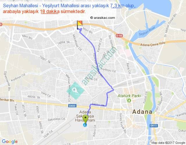 Seyhan Mahallesi - Yeşilyurt Mahallesi arası yaklaşık olarak 90 km/h ile yukarıda belirtilen sürede olup, iki yerin kuş uçuşu uzaklığı (mesafesi) 5'dir. Yolculuk otobüsle 23 dakika sürmektedir.
