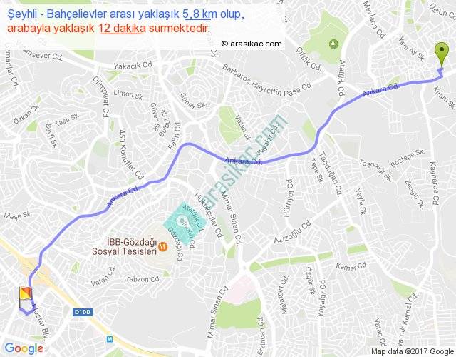 Şeyhli - Bahçelievler arası yaklaşık olarak 90 km/h ile yukarıda belirtilen sürede olup, iki yerin kuş uçuşu uzaklığı (mesafesi) 5'dir. Yolculuk otobüsle 15 dakika sürmektedir.