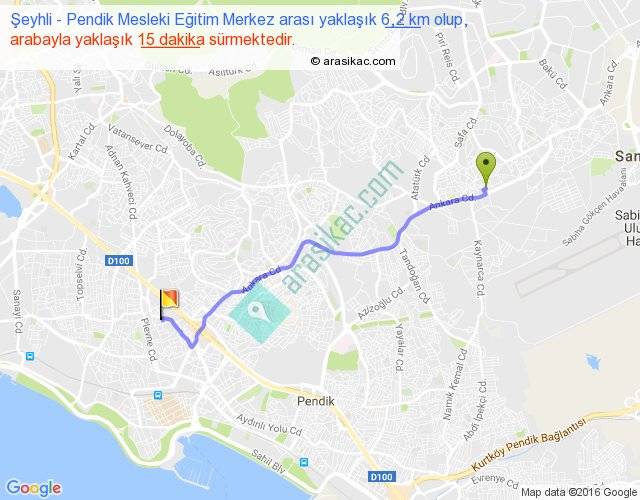 Şeyhli - Pendik Mesleki Eğitim Merkez arası yaklaşık olarak 90 km/h ile yukarıda belirtilen sürede olup, iki yerin kuş uçuşu uzaklığı (mesafesi) 5'dir. Yolculuk otobüsle 19 dakika sürmektedir.