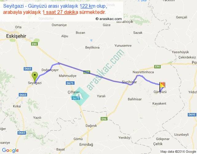 Seyitgazi - Günyüzü arası yaklaşık olarak 90 km/h ile yukarıda belirtilen sürede olup, iki yerin kuş uçuşu uzaklığı (mesafesi) 96'dir. Yolculuk otobüsle 1 saat 53 dakika sürmektedir.