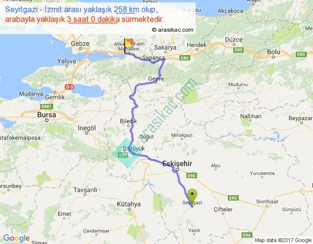 Seyitgazi - İzmit arası yaklaşık olarak 90 km/h ile yukarıda belirtilen sürede olup, iki yerin kuş uçuşu uzaklığı (mesafesi) 159'dir. Yolculuk otobüsle 3 saat 54 dakika sürmektedir.