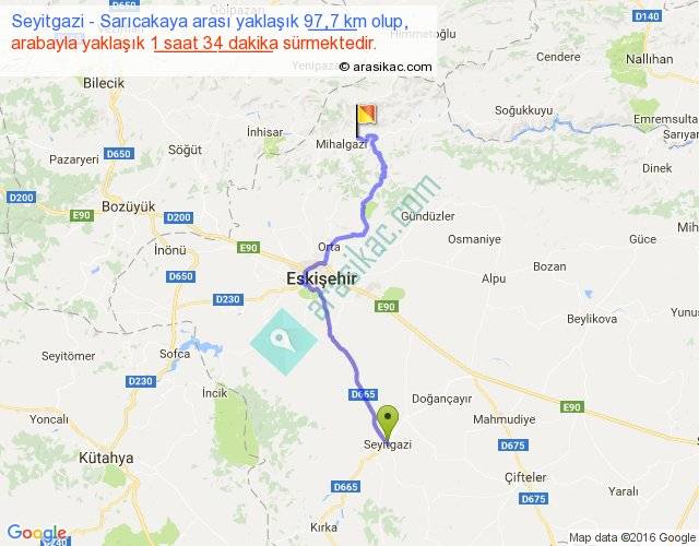 Seyitgazi - Sarıcakaya arası yaklaşık olarak 90 km/h ile yukarıda belirtilen sürede olup, iki yerin kuş uçuşu uzaklığı (mesafesi) 66'dir. Yolculuk otobüsle 2 saat 2 dakika sürmektedir.
