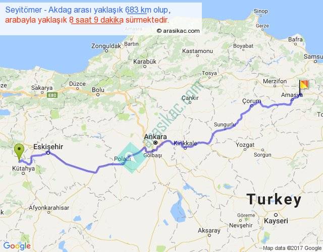 Seyitömer - Akdag arası yaklaşık olarak 90 km/h ile yukarıda belirtilen sürede olup, iki yerin kuş uçuşu uzaklığı (mesafesi) 531'dir. Eğer belirtilen yerler arasında uçak seferi var ise bu süre uçakla 49 dakika'ya kadar düşebilir. Yolculuk otobüsle 10 saat 35 dakika sürmektedir.