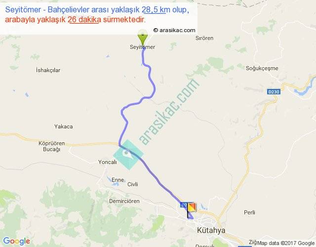 Seyitömer - Bahçelievler arası yaklaşık olarak 90 km/h ile yukarıda belirtilen sürede olup, iki yerin kuş uçuşu uzaklığı (mesafesi) 21'dir. Yolculuk otobüsle 33 dakika sürmektedir.