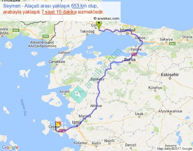 Seymen - Alaçati arası yaklaşık olarak 90 km/h ile yukarıda belirtilen sürede olup, iki yerin kuş uçuşu uzaklığı (mesafesi) 337'dir. Eğer belirtilen yerler arasında uçak seferi var ise bu süre uçakla 31 dakika'ya kadar düşebilir. Yolculuk otobüsle 9 saat 19 dakika sürmektedir.