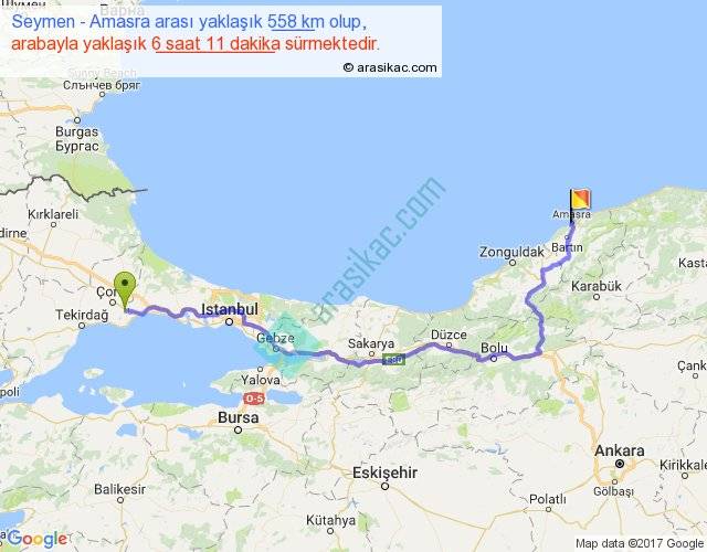 Seymen - Amasra arası yaklaşık olarak 90 km/h ile yukarıda belirtilen sürede olup, iki yerin kuş uçuşu uzaklığı (mesafesi) 375'dir. Eğer belirtilen yerler arasında uçak seferi var ise bu süre uçakla 34 dakika'ya kadar düşebilir. Yolculuk otobüsle 8 saat 2 dakika sürmektedir.