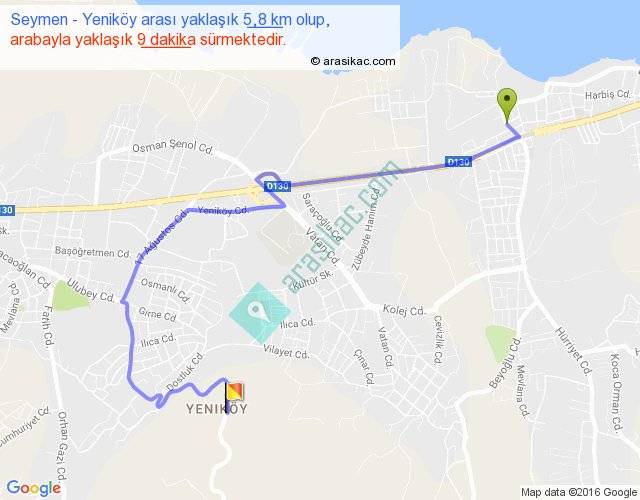 Seymen - Yeniköy arası yaklaşık olarak 90 km/h ile yukarıda belirtilen sürede olup, iki yerin kuş uçuşu uzaklığı (mesafesi) 3'dir. Yolculuk otobüsle 11 dakika sürmektedir.