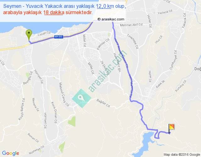 Seymen - Yuvacık Yakacık arası yaklaşık olarak 90 km/h ile yukarıda belirtilen sürede olup, iki yerin kuş uçuşu uzaklığı (mesafesi) 8'dir. Yolculuk otobüsle 23 dakika sürmektedir.