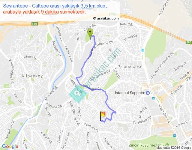 Seyrantepe - Gültepe arası yaklaşık olarak 90 km/h ile yukarıda belirtilen sürede olup, iki yerin kuş uçuşu uzaklığı (mesafesi) 2'dir. Yolculuk otobüsle 11 dakika sürmektedir.