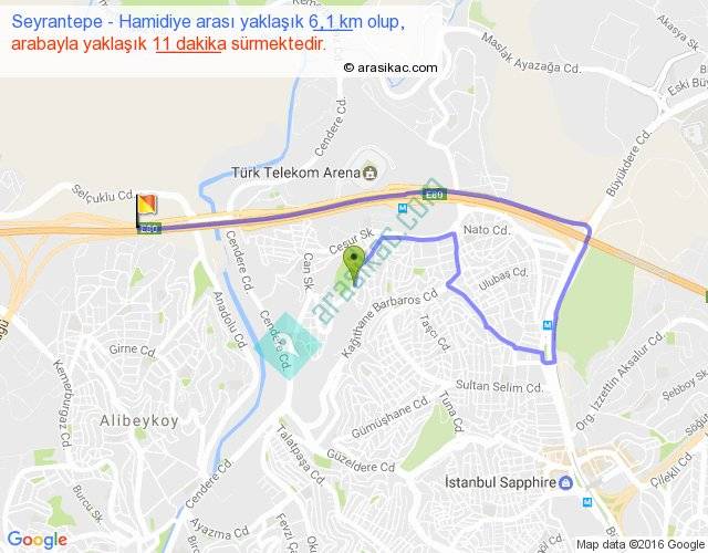 Eğer Seyrantepe Hamidiye arası ne kadar yakar (benzin/mazot) diyorsanız, kilometrede 3 ₺ yakan bir aracınız var ise 18, km'de 4 ₺ yakan bir aracınız var ise 24, km'de 5 ₺ yakan bir aracınız var ise 30 ile bu yolculuğu tamamlayabilirsiniz.