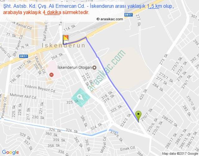 Şht. Astsb. Kd. Çvş. Ali Ermercan Cd. - İskenderun arası yaklaşık olarak 90 km/h ile yukarıda belirtilen sürede olup, iki yerin kuş uçuşu uzaklığı (mesafesi) 1'dir. Yolculuk otobüsle 5 dakika sürmektedir.
