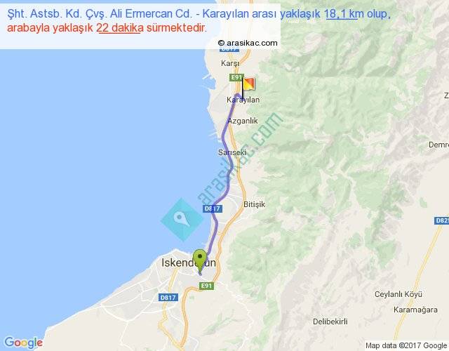 Şht. Astsb. Kd. Çvş. Ali Ermercan Cd. - Karayılan arası yaklaşık olarak 90 km/h ile yukarıda belirtilen sürede olup, iki yerin kuş uçuşu uzaklığı (mesafesi) 16'dir. Yolculuk otobüsle 28 dakika sürmektedir.