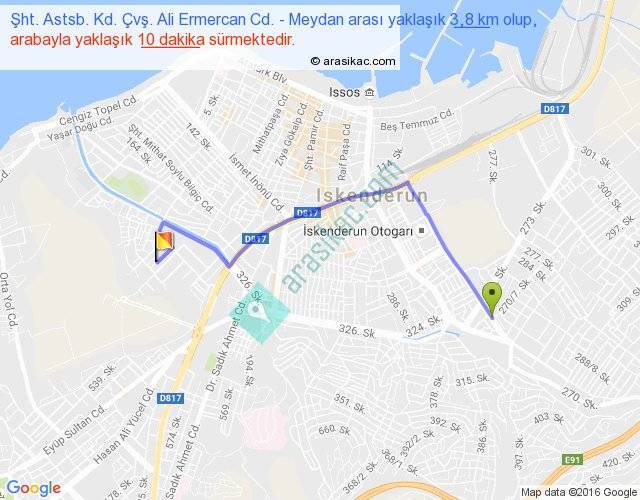Şht. Astsb. Kd. Çvş. Ali Ermercan Cd. - Meydan arası yaklaşık olarak 90 km/h ile yukarıda belirtilen sürede olup, iki yerin kuş uçuşu uzaklığı (mesafesi) 3'dir. Yolculuk otobüsle 13 dakika sürmektedir.