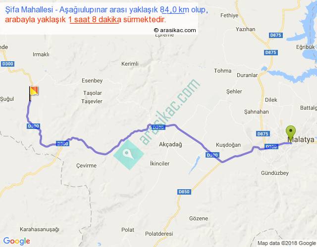 Şifa Mahallesi - Aşağıulupınar arası yaklaşık olarak 90 km/h ile yukarıda belirtilen sürede olup, iki yerin kuş uçuşu uzaklığı (mesafesi) 63'dir. Yolculuk otobüsle 1 saat 28 dakika sürmektedir.