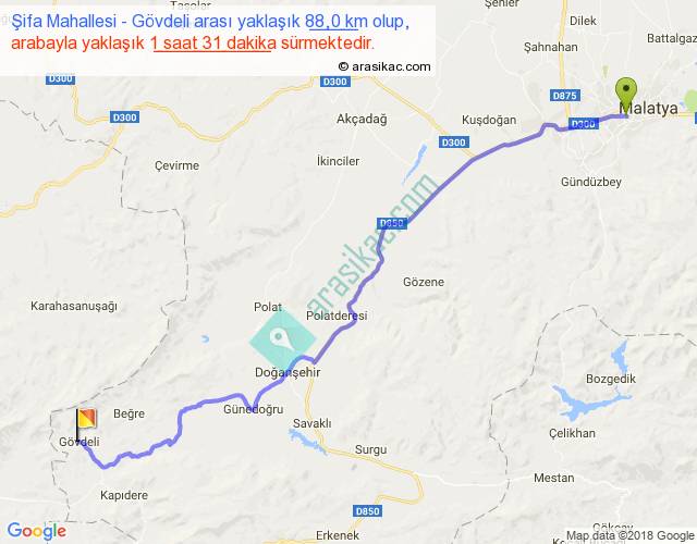 Şifa Mahallesi - Gövdeli arası yaklaşık olarak 90 km/h ile yukarıda belirtilen sürede olup, iki yerin kuş uçuşu uzaklığı (mesafesi) 70'dir. Yolculuk otobüsle 1 saat 58 dakika sürmektedir.