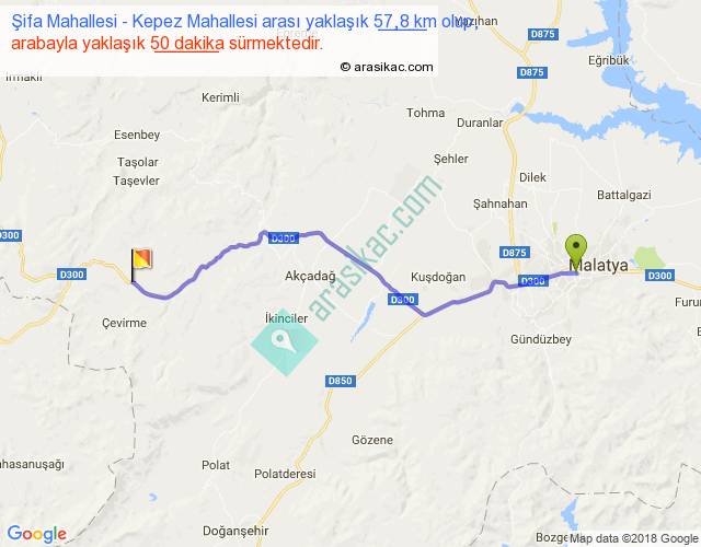 Şifa Mahallesi - Kepez Mahallesi arası yaklaşık olarak 90 km/h ile yukarıda belirtilen sürede olup, iki yerin kuş uçuşu uzaklığı (mesafesi) 48'dir. Yolculuk otobüsle 1 saat 5 dakika sürmektedir.