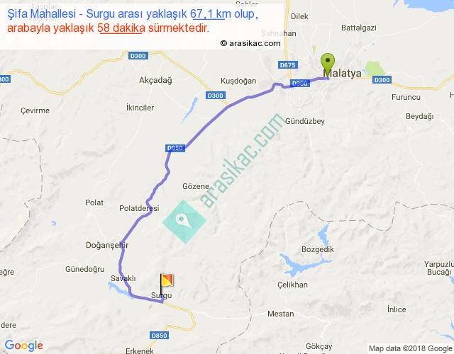 Şifa Mahallesi - Surgu arası yaklaşık olarak 90 km/h ile yukarıda belirtilen sürede olup, iki yerin kuş uçuşu uzaklığı (mesafesi) 46'dir. Yolculuk otobüsle 1 saat 15 dakika sürmektedir.