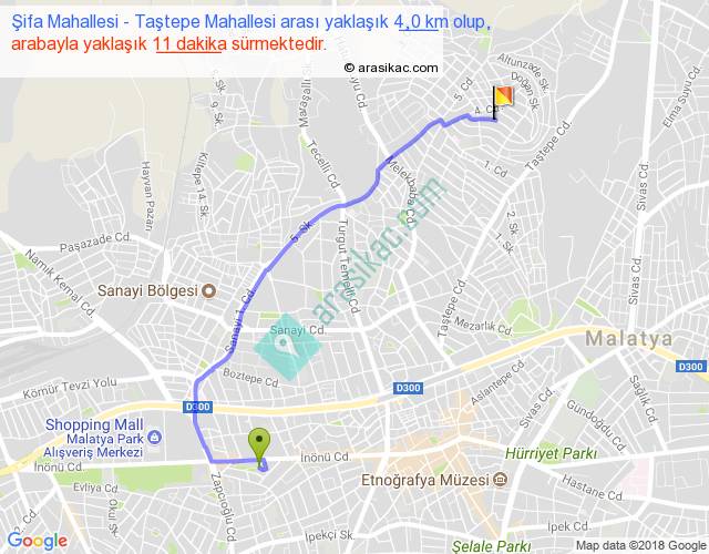 Şifa Mahallesi - Taştepe Mahallesi arası yaklaşık olarak 90 km/h ile yukarıda belirtilen sürede olup, iki yerin kuş uçuşu uzaklığı (mesafesi) 3'dir. Yolculuk otobüsle 14 dakika sürmektedir.