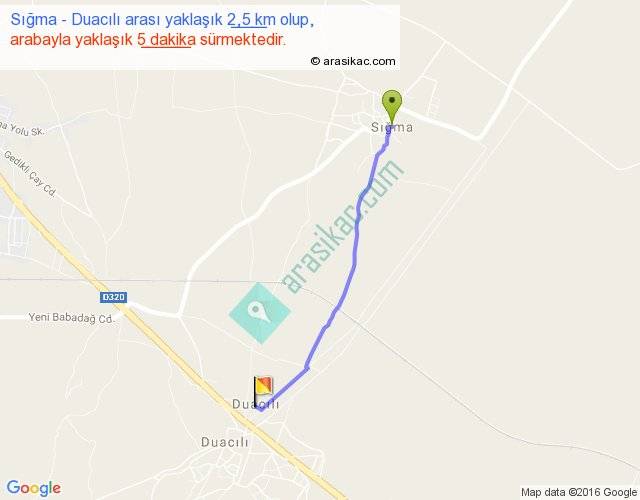 Sığma - Duacılı arası yaklaşık olarak 90 km/h ile yukarıda belirtilen sürede olup, iki yerin kuş uçuşu uzaklığı (mesafesi) 2'dir. Yolculuk otobüsle 6 dakika sürmektedir.